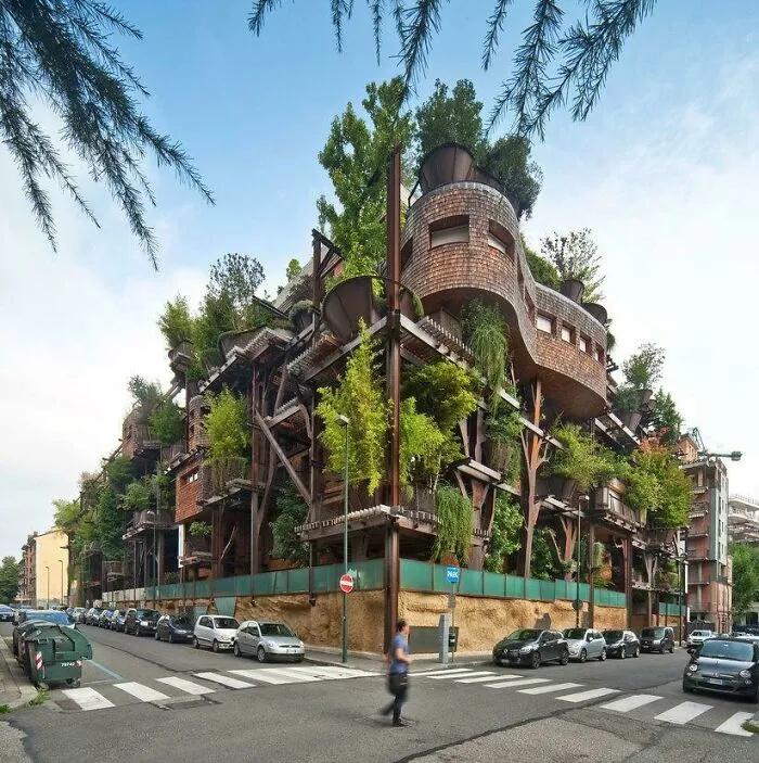 意大利都靈城市中心的Verde公寓在樓上種了150棵樹外形類似兒時童話書中的樹屋。獨特的立體綠化布局讓這座建筑成為都市中心的森林居所。