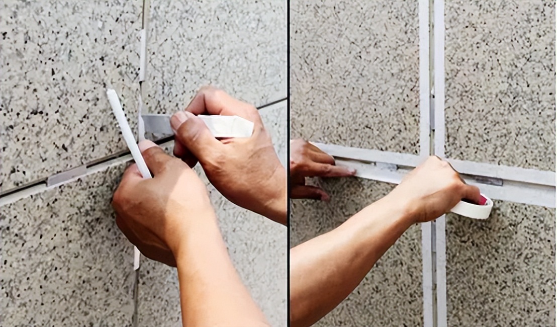 在分隔的縫隙內,塞填保溫填縫條(泡沫填縫條),縫隙兩端粘貼美紋紙。