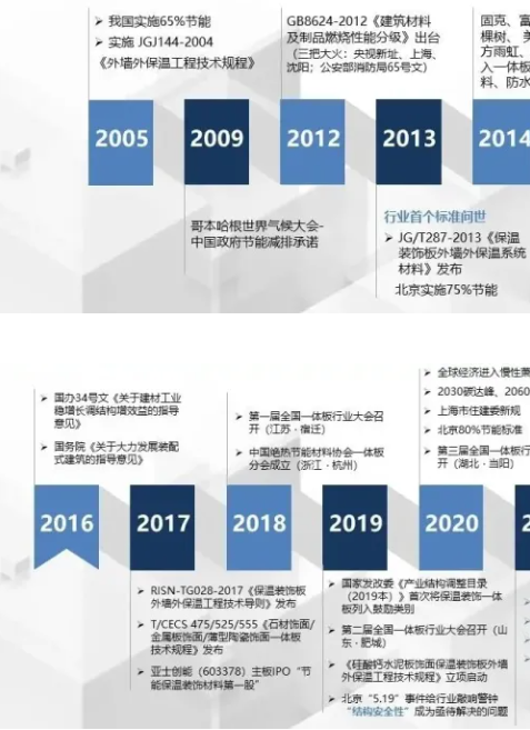 2017年《保溫裝飾板外墻外保溫工程技術導則》、《石材飾面/金屬板飾面/薄型陶瓷飾面一體板技術規程》發布,保溫裝飾一體板開始百花齊放。