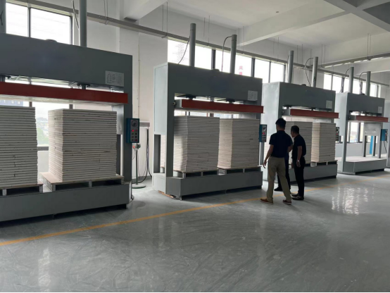 熱壓:鋁板保溫一體板與保溫材料在熱壓生產(chǎn)線進(jìn)行除塵、噴膠、壓制一體成型,可以做到6分鐘快速成品。