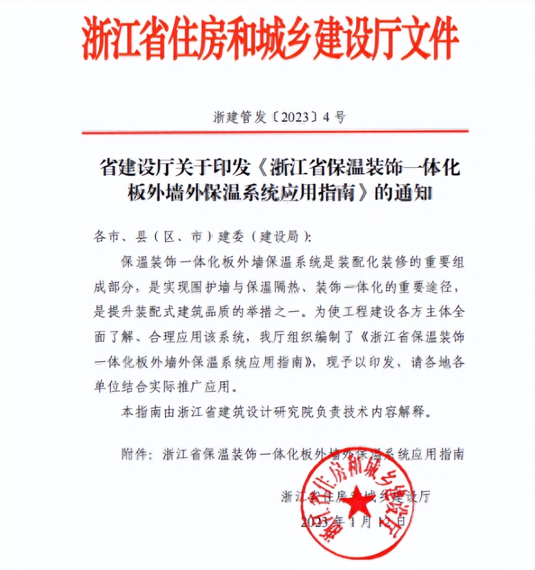 2023年1月12日,浙江省建設廳發布《浙江省保溫裝飾一體化板外墻外保溫系統應用指南》。