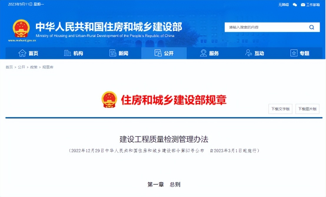2022年12月29日中華人民共和國住房和城鄉建設部令第57號公布《建設工程質量檢測管理辦法》,自2023年3月1日起正式施行。