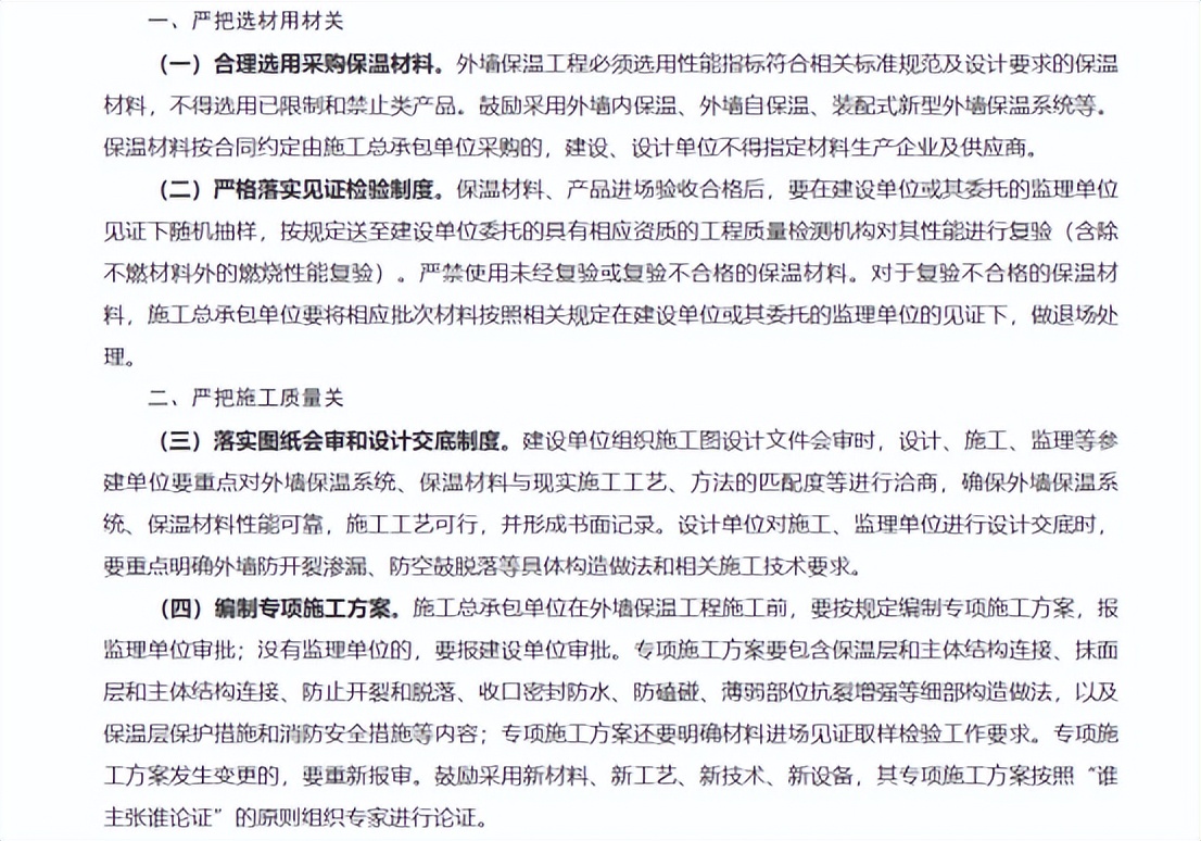 (三)落實圖紙會審和設計交底制度。建設單位組織施工圖設計文件會審時,設計、施工、監理等參建單位要重點對外墻保溫系統、保溫材料與現實施工工藝、方法的匹配度等進行洽商,確保外墻保溫系統、保溫材料性能可靠,施工工藝可行,并形成書面記錄。設計單位對施工、監理單位進行設計交底時,要重點明確外墻防開裂滲漏、防空鼓脫落等具體構造做法和相關施工技術要求。