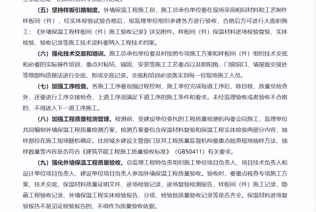 (八)加強工程質量檢測管理。檢測前,受建設單位委托的工程質量檢測機構要會同施工、監理單位共同編制外墻保溫工程質量檢測方案,檢測方案要包含保溫材料復驗和保溫工程實體檢驗兩部分內容,抽樣部位在施工現場隨機確定。住房城鄉建設主管部門及其工程質量監督機構要重點核查現場抽樣方法、抽樣數量等內容是否符合《建筑節能工程施工質量驗收標準》(GB50411)有關要求。