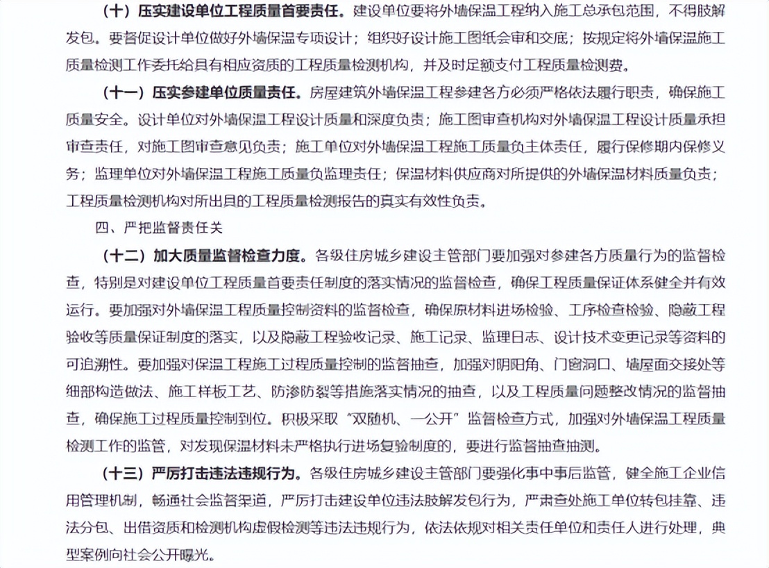 (十)壓實建設單位工程質量首要責任。建設單位要將外墻保溫工程納入施工總承包范圍,不得肢解發包。要督促設計單位做好外墻保溫專項設計;組織好設計施工圖紙會審和交底;按規定將外墻保溫施工質量檢測工作委托給具有相應資質的工程質量檢測機構,并及時足額支付工程質量檢測費。