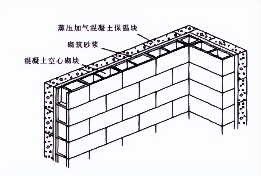(3)自保溫體系復合外墻:如蒸壓加氣混凝土砌塊復合保溫外墻。復合保溫外墻的外圍是蒸壓加氣混凝土保溫塊圍護結(jié)構(gòu),起保溫作用,內(nèi)層是混凝土空心砌塊墻或現(xiàn)澆混凝土墻,起支承作用。中間層是砌筑砂漿,起粘結(jié)作用。復合保溫外墻的構(gòu)造作法原則:在寒冷和嚴寒地區(qū)宜采用B03或B04級制品做保溫材料。